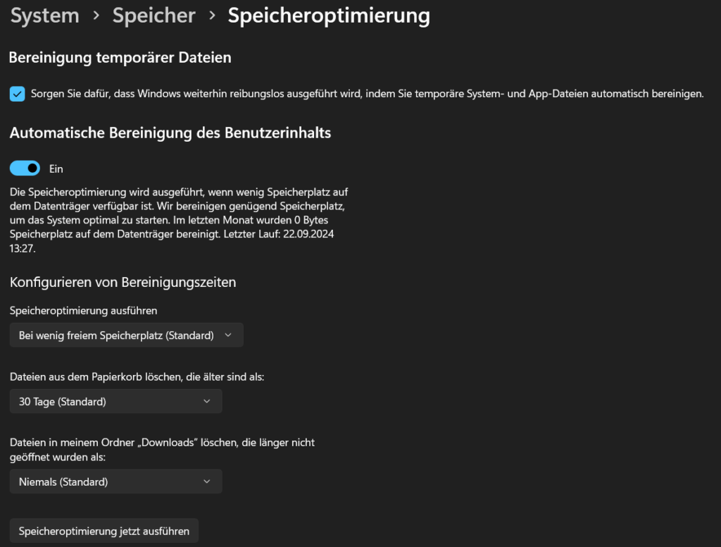 Optional können Sie auf „Speicheroptimierung jetzt ausführen” klicken, um die Speicheroptimierung sofort laufen zu lassen.