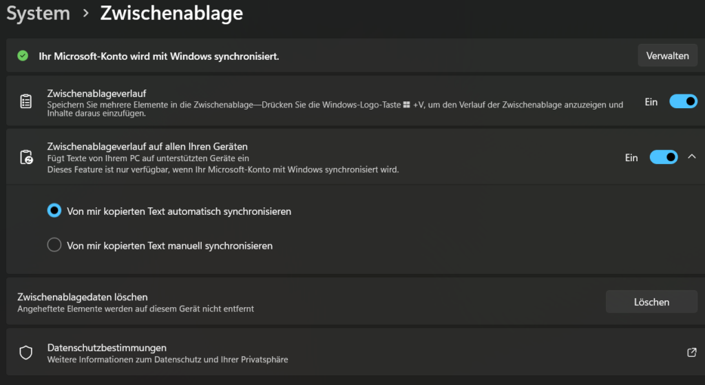 Optional können Sie auch den Zwischenablageverlauf auf allen Ihren Geräten aktivieren, um die Zwischenablagedaten auf allen Ihren PCs automatisch zu synchronisieren.